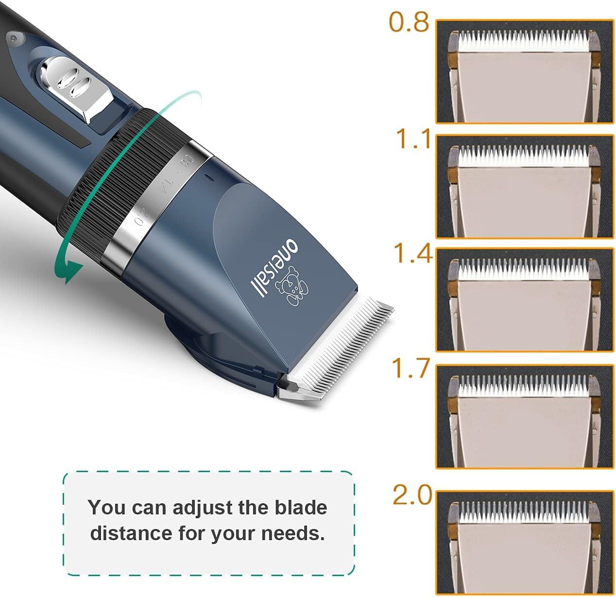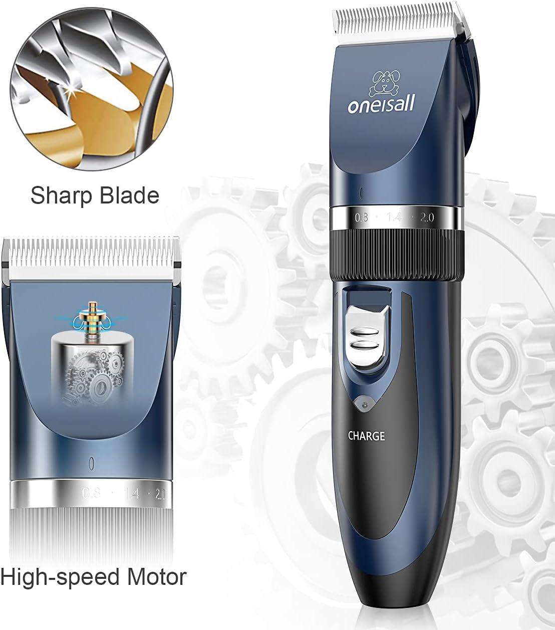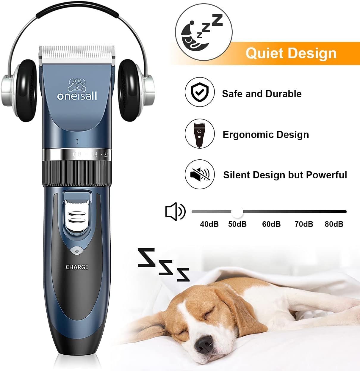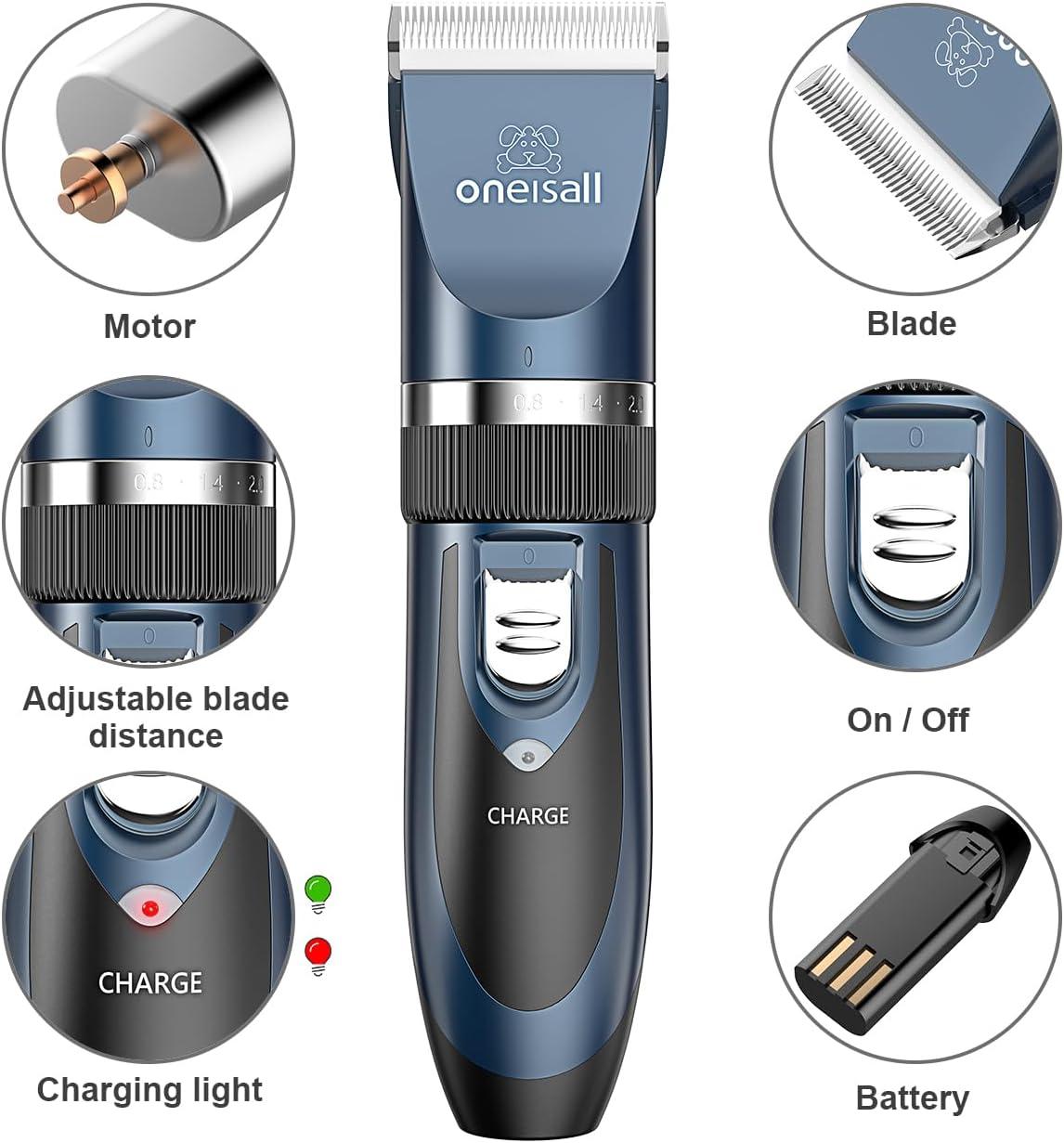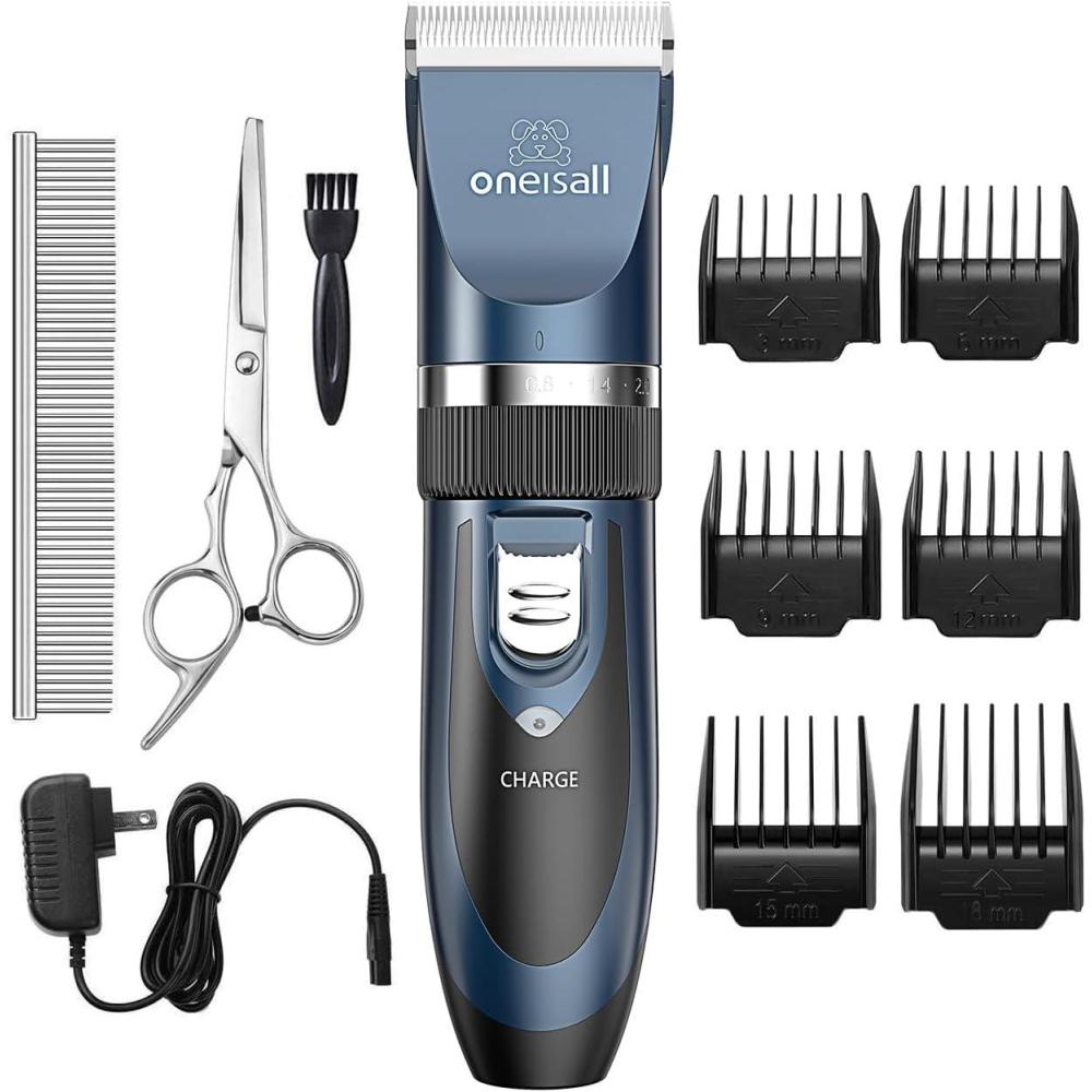 Dog Grooming Clippers Description: [Safe & Sharp Blades] – Oneisall dog clippers feature upgraded stainless steel fixed blades combined with ceramic moving blades delivering exceptional cutting performance. The blades can stay sharp for extended periods, providing a comfortable and safe grooming experience for your beloved pet. [Powerful Motor for Unrivaled Performance] – Engineered for outstanding durability and stability, and Oneisall dog clipper cuts through thick fur with ease, ensuring a snag-free experience that both you and your pet will appreciate. [Low Vibration, Ultra-quiet Design] – Oneisall dog grooming clippers with a working noise of only around 50 decibels, won't make your dog scared. Your pet will feel at ease during grooming sessions, saying goodbye to haircut anxiety. [Built-in Rechargeable Battery] – Oneisall dog clippers for grooming come with a built-in rechargeable battery, so you don't have to worry about it stopping working. No more worries about running out of power during grooming sessions or the hassle of battery replacements. [Detachable Blades for Easy Cleaning] – The removable blades of Oneisall dog clippers are not only easy to replace but also a breeze to clean. The body is not waterproof, but you can remove the blade and rinse it directly under running water. [Cordless & Convenience] – Designed cordless, Oneisall dog grooming kit offers effortless maneuverability without the hassle of tangled wires. Its lightweight and portable design makes grooming on the go a breeze. [With 6 Guard Combs] – Oneisall dog clippers are equipped with 6 detachable guide combs to accommodate various pet hair lengths (3mm/6mm/9mm/12mm/15mm/18mm). These guide combs offer versatility and swift interchangeability. [What You Get] – Oneisall dog grooming clipper kit including 1 dog clipper, 6 guard combs, 1 steel comb, 1 pair of scissors, 1 AC power adapter, 1 cleaning brush, and 1 bottle of 5ml lubricant.